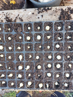 I planted a plastic module with 'Snowball' onions yesterday. They will have lovely white root socks when I plant them out in a few weeks. They are living in my polytunnel at the moment. It's much better than just pushing them in the wet and cold earth.